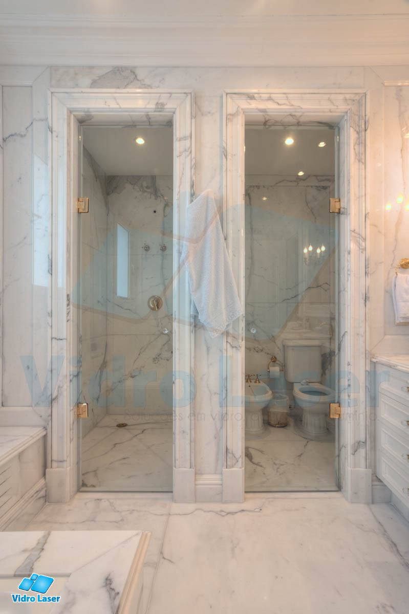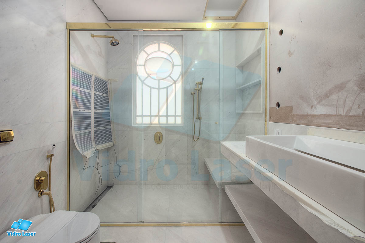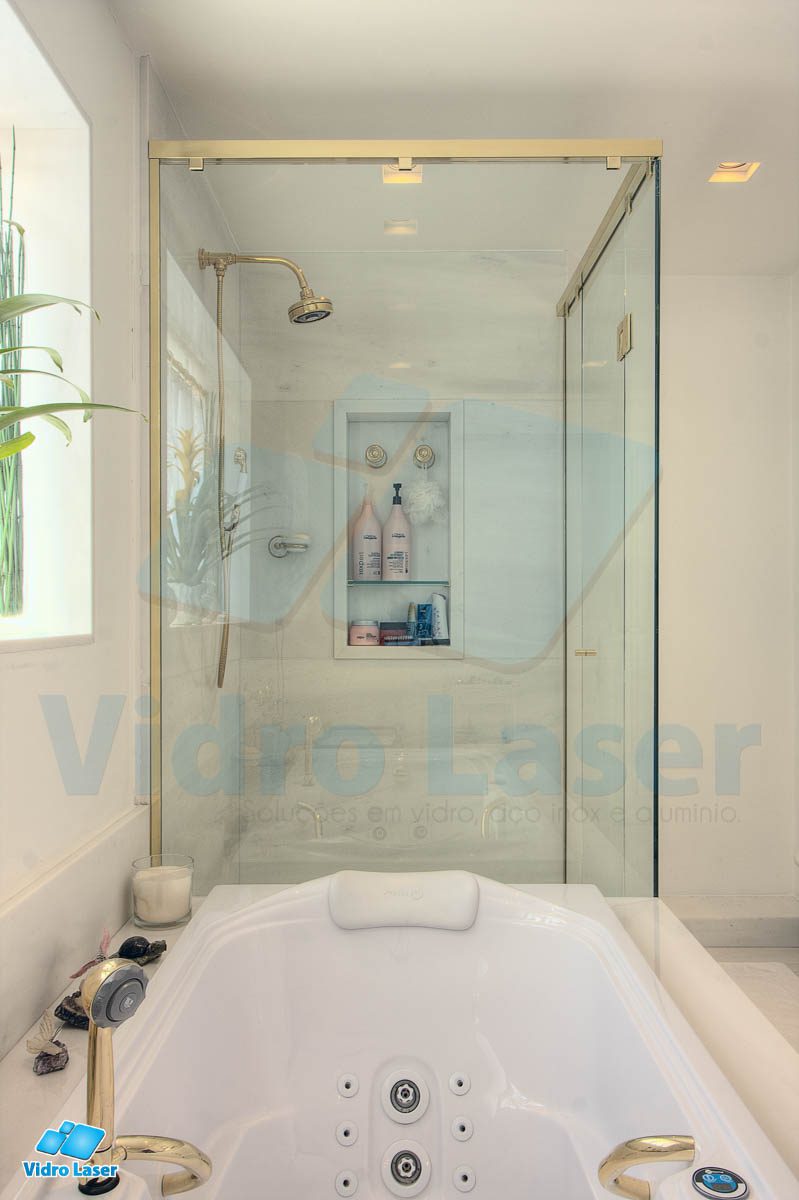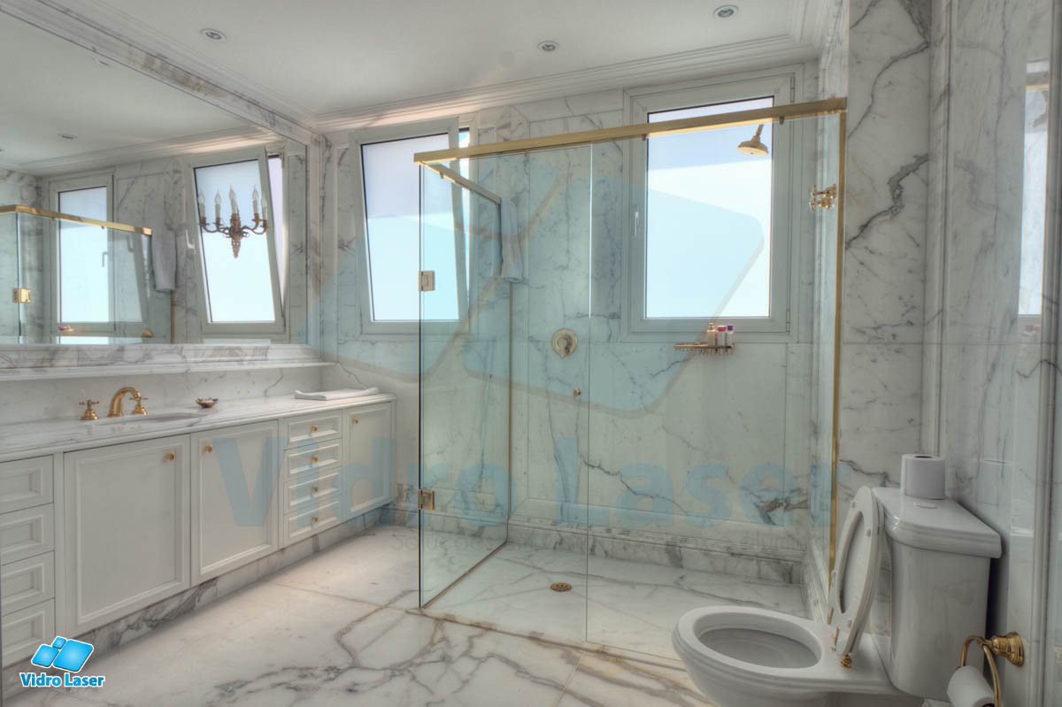 As ferragens e perfis do seu box Vidro Laser podem ser em latão e cobre também.
