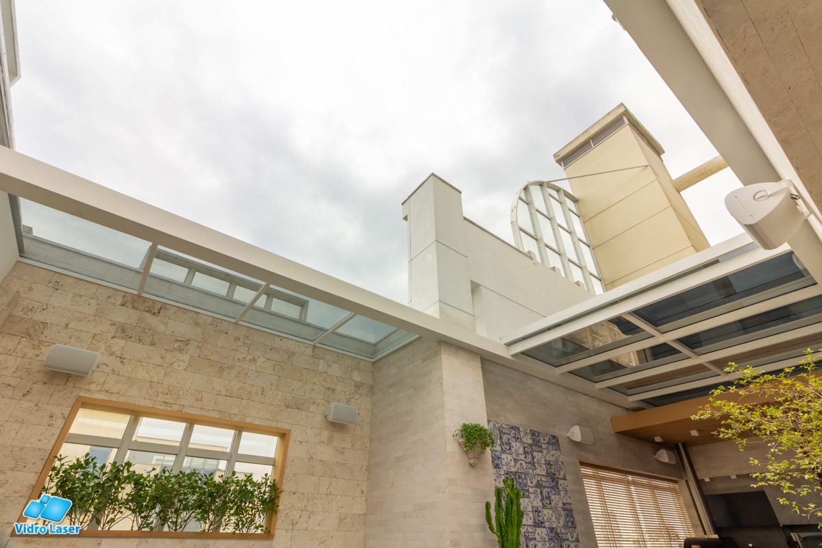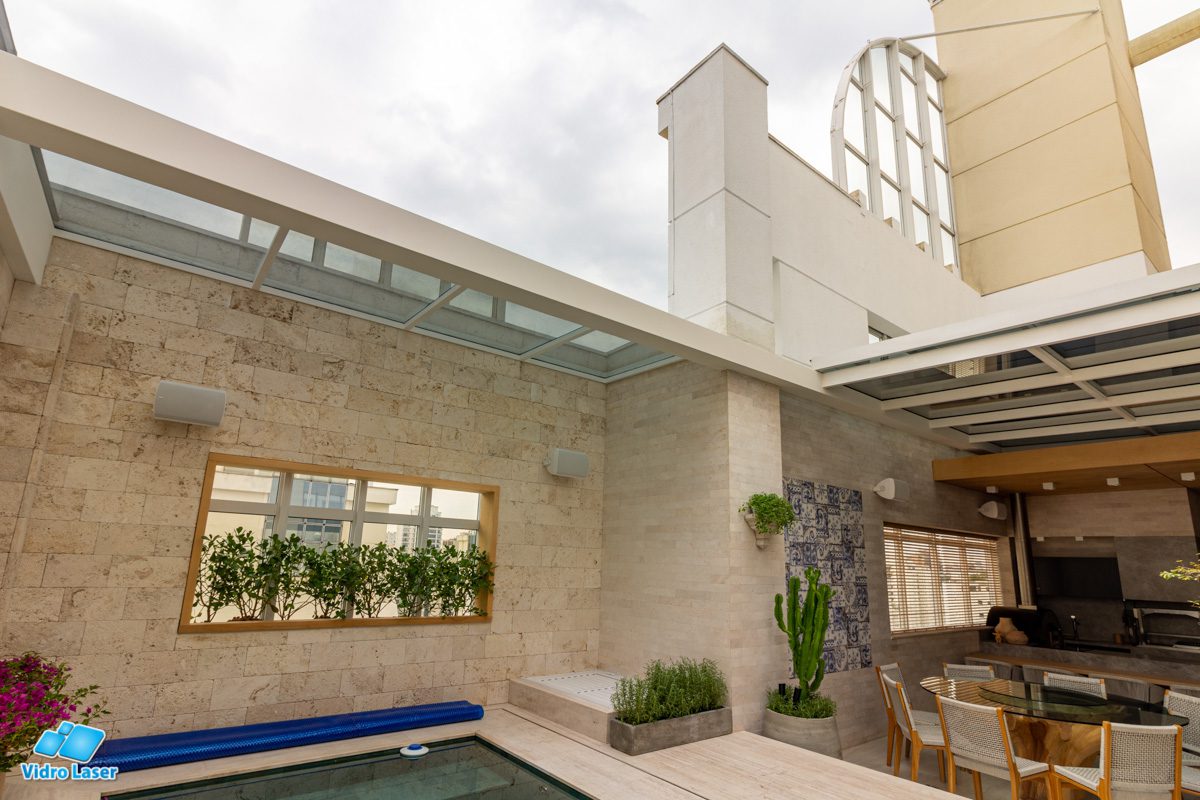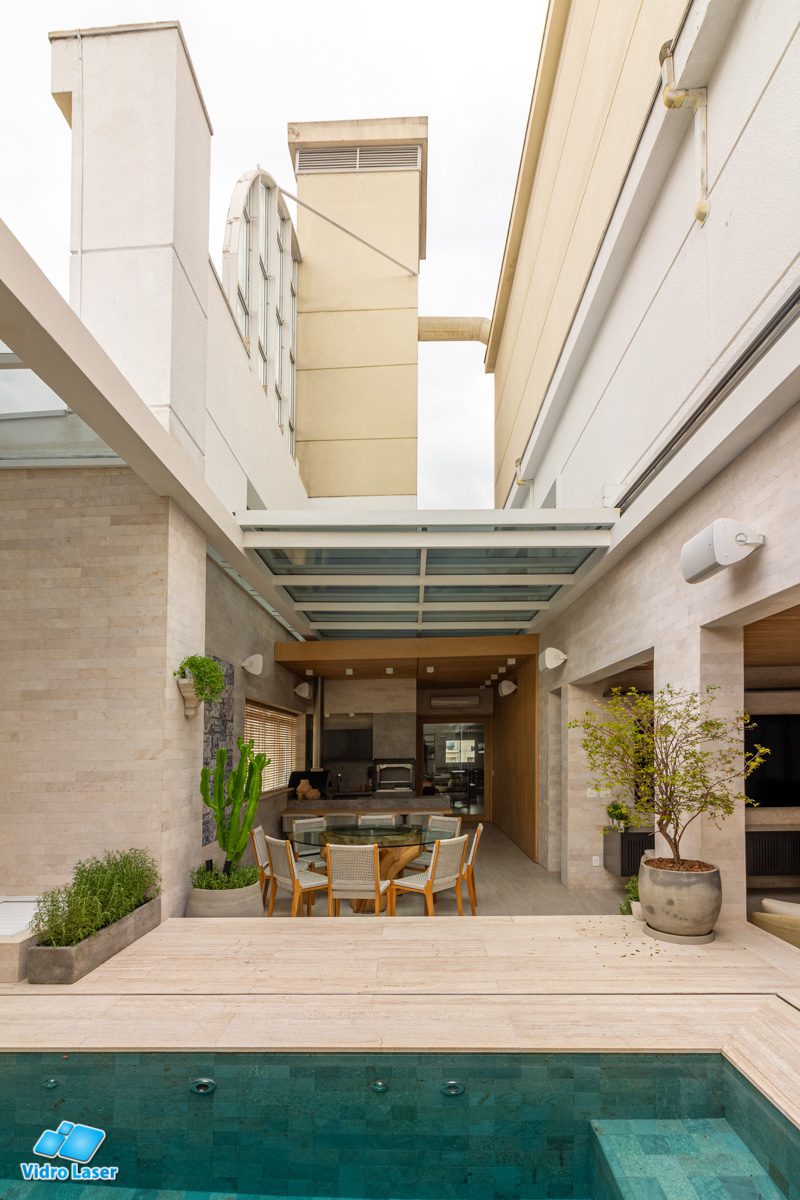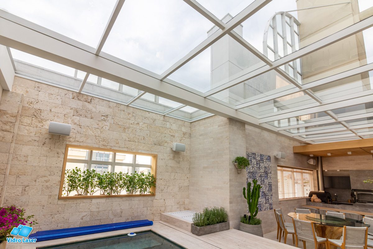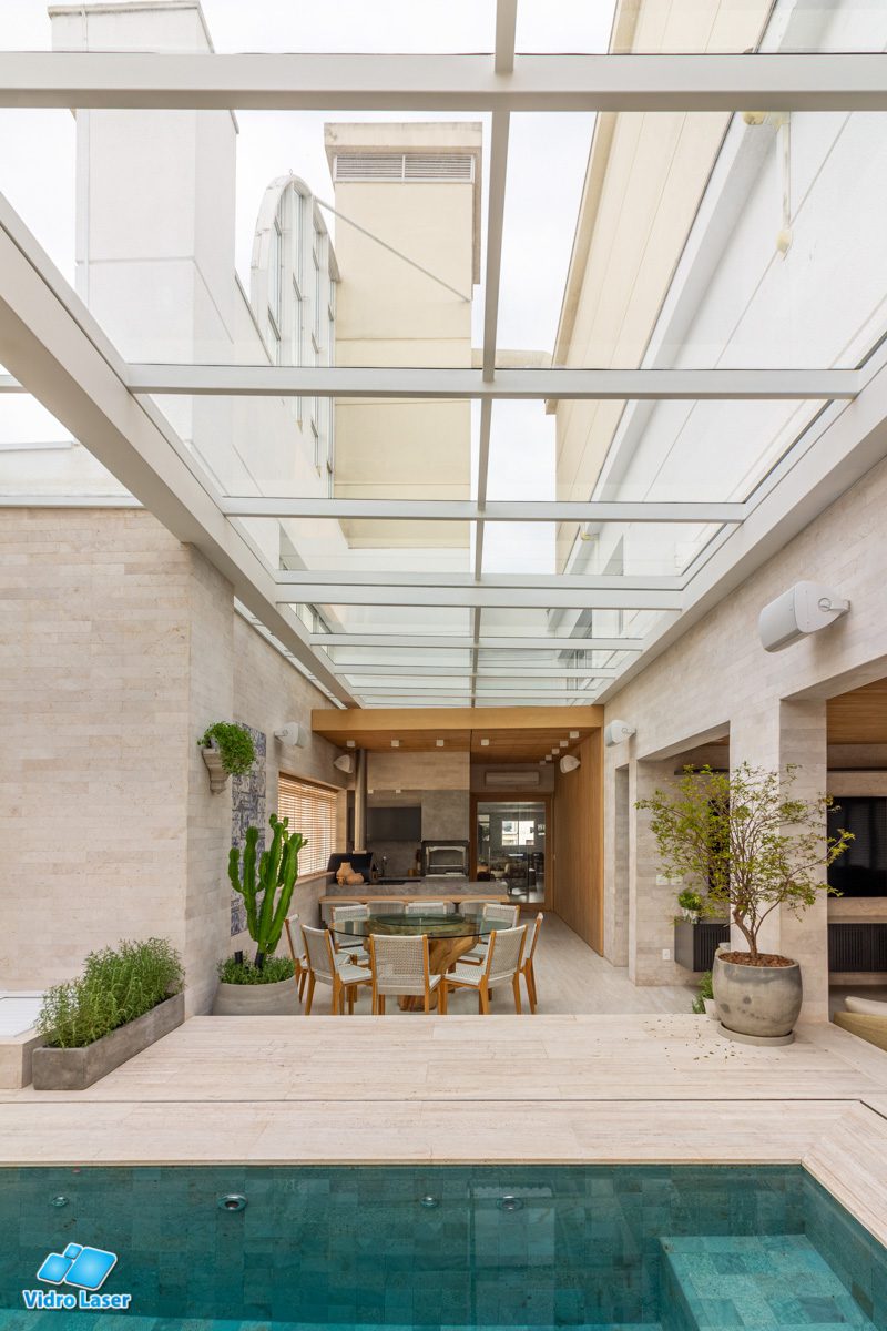 O vidro deixa o ambiente muito quente? Não necessariamente. Recomendamos o uso de vidros com proteção solar (controle térmico) para o seu teto retratil para piscina. Eles bloqueiam os raios UV prejudiciais e reduzem a entrada de calor, mantendo a luminosidade sem criar um “efeito lupa” desconfortável.