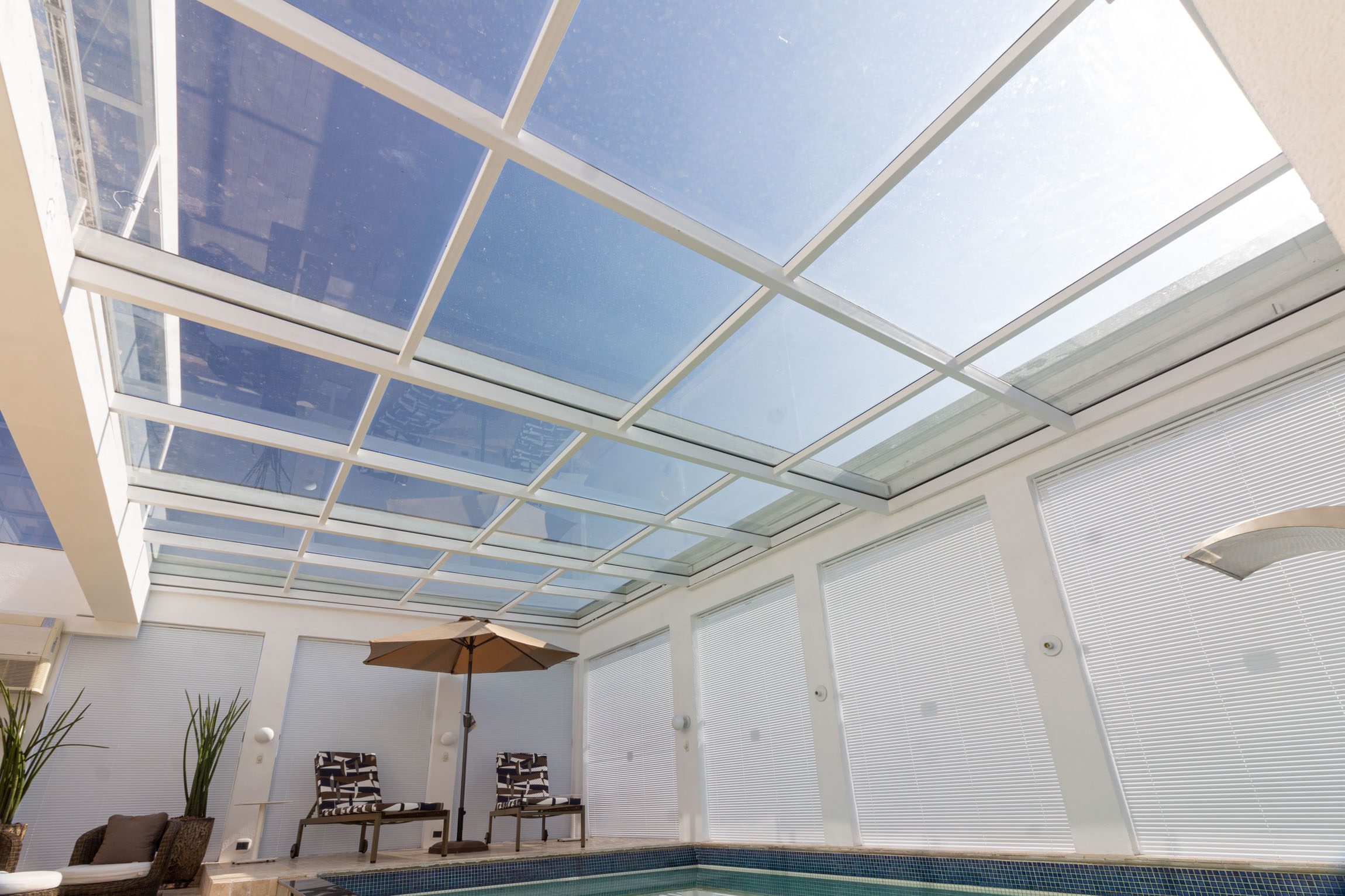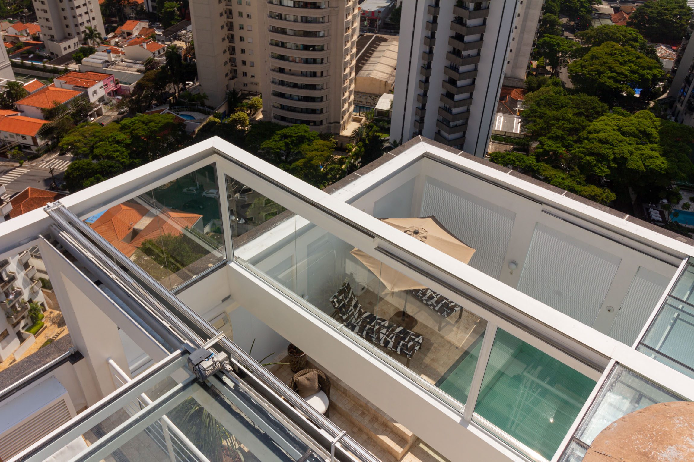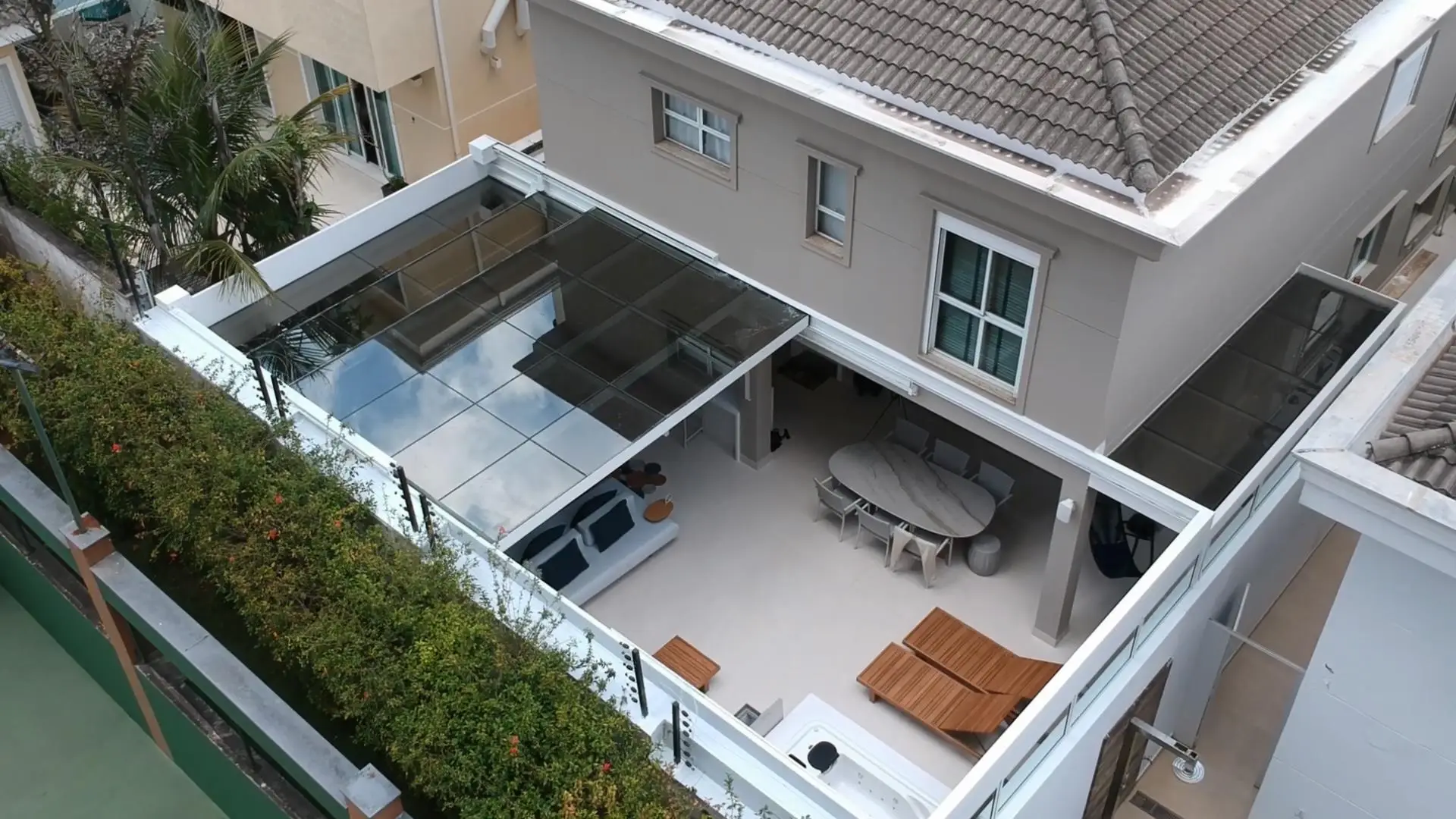 Este Teto de Vidro Retrátil Automatizado foi construído sobre jardim interno garantindo a entrada de luz e ventilação. O acionamento da cobertura retrátil é realizado por controle remoto. A cobertura de vidro conta com vidros refletivos que reduzem a entrada de raios uv, controlando a temperatura interna.