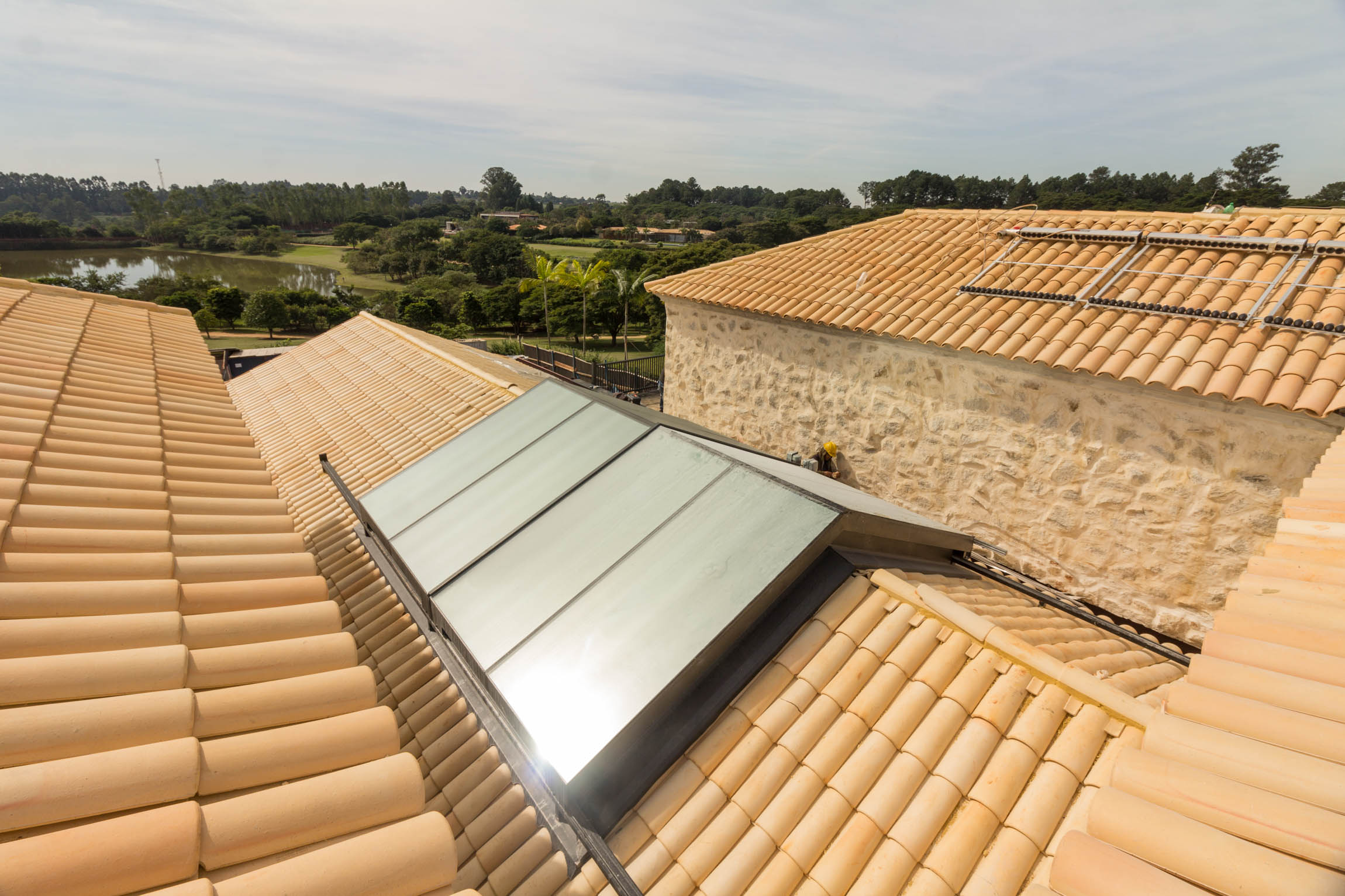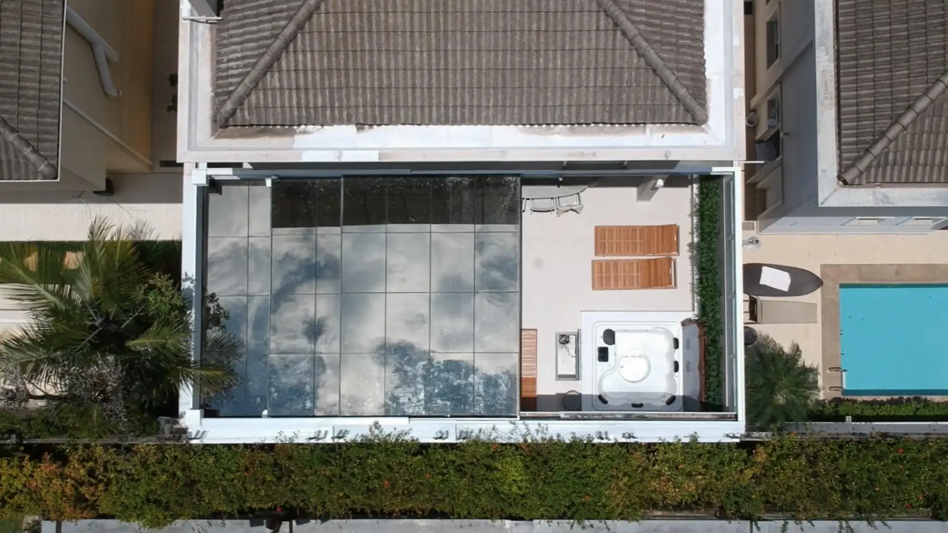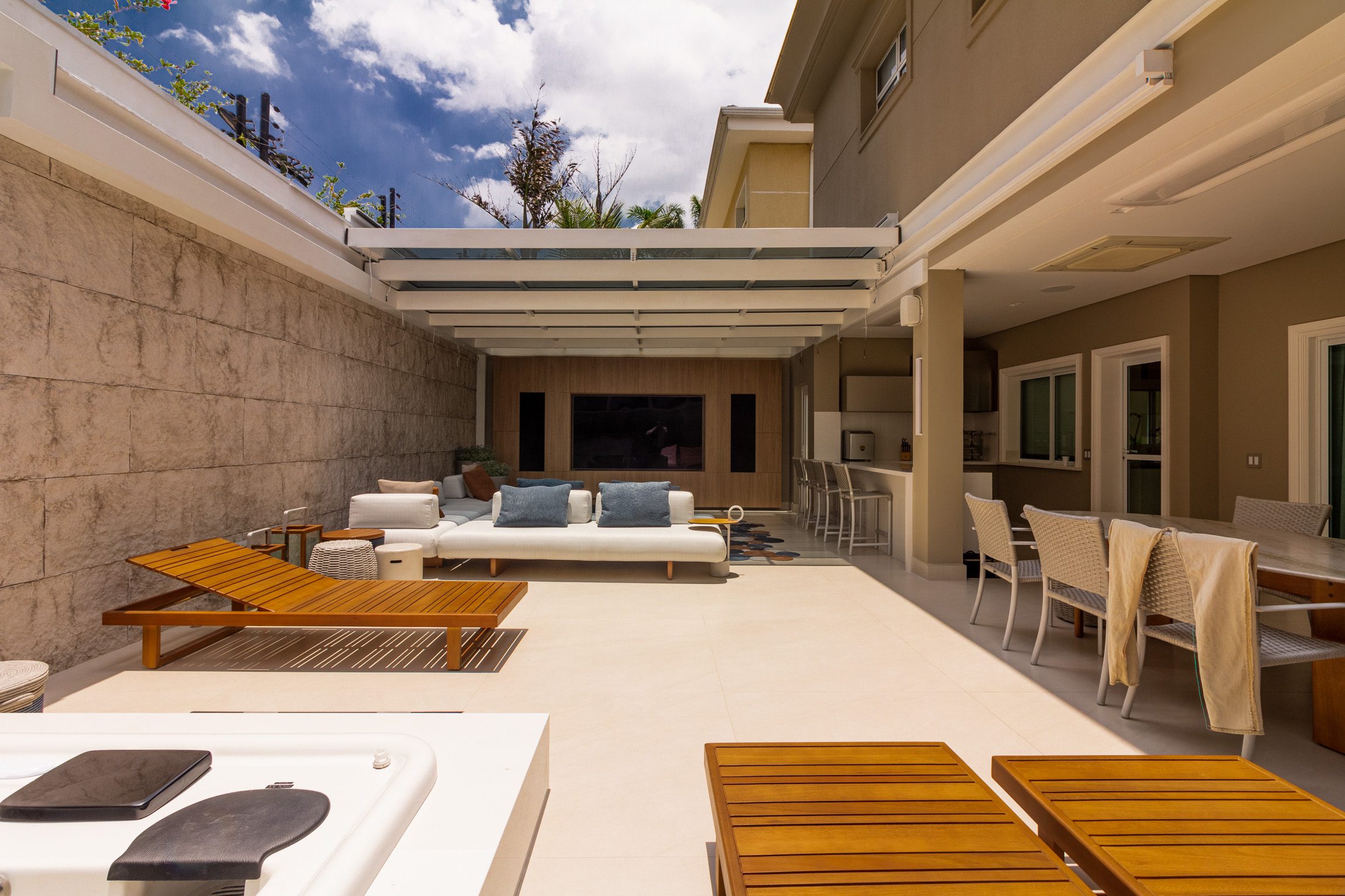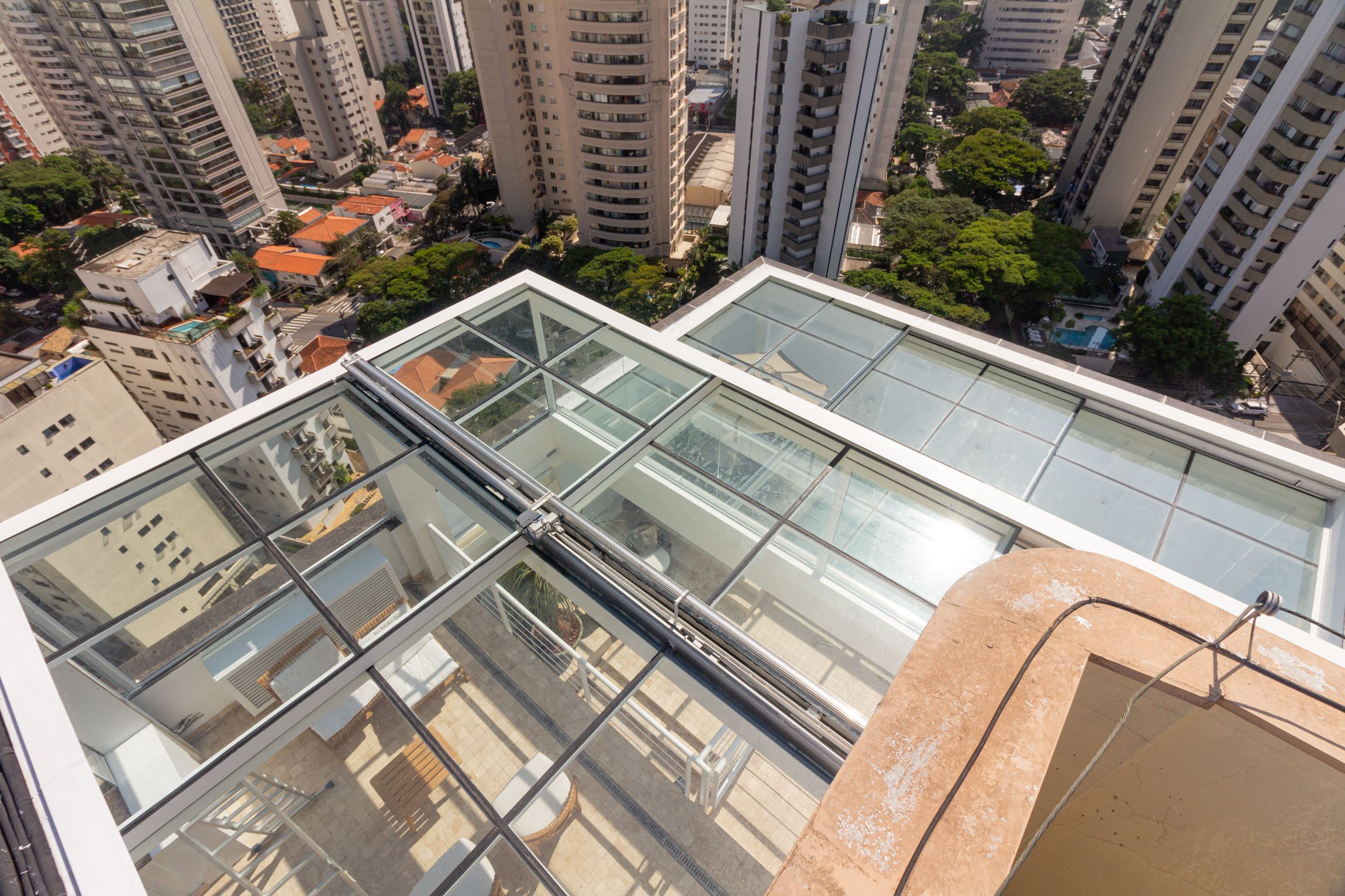 Este Teto de Vidro Retrátil Automatizado foi construído sobre jardim interno garantindo a entrada de luz e ventilação. O acionamento da cobertura retrátil é realizado por controle remoto. A cobertura de vidro conta com vidros refletivos que reduzem a entrada de raios uv, controlando a temperatura interna.