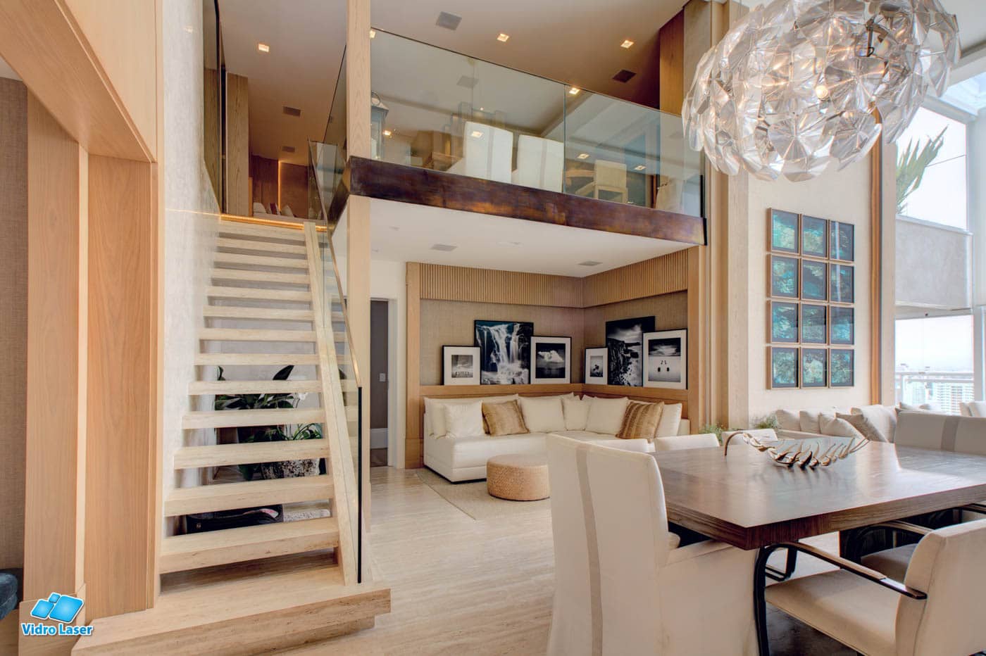 E se você tem uma sacada com o pé direito duplo? Olha que interessante este mezanino metálico com piso de vidros que construímos: no lugar de uma cobertura de vidros foi construído um mezanino metálico com piso de vidros transitáveis, assim aumentou-se a área útil do apartamento, ganhando um novo cômodo interno, que não perdeu sua iluminação, natural graças ao piso de vidros e no andar de cima a nova área externa ficou muito mais moderna e divertida.